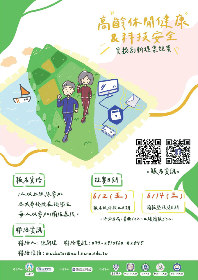 - 高齡休閒健康及科技安全實務創新提案競賽競賽依據「112年教育部補助辦理人文社會與產業實務創新鏈結計畫」,國立暨南國際大學所提之「高齡休閒健康與科技安全跨域人才實務創新鏈結計畫」辦理,為推動大專院校人社領域學生針對產業需求,進行跨域合作。讓學生能夠透過競賽過程,提出可於場域實作的專題方案或具商業價值的創新構想,藉由競賽辦理檢驗是否符合其產業需求。